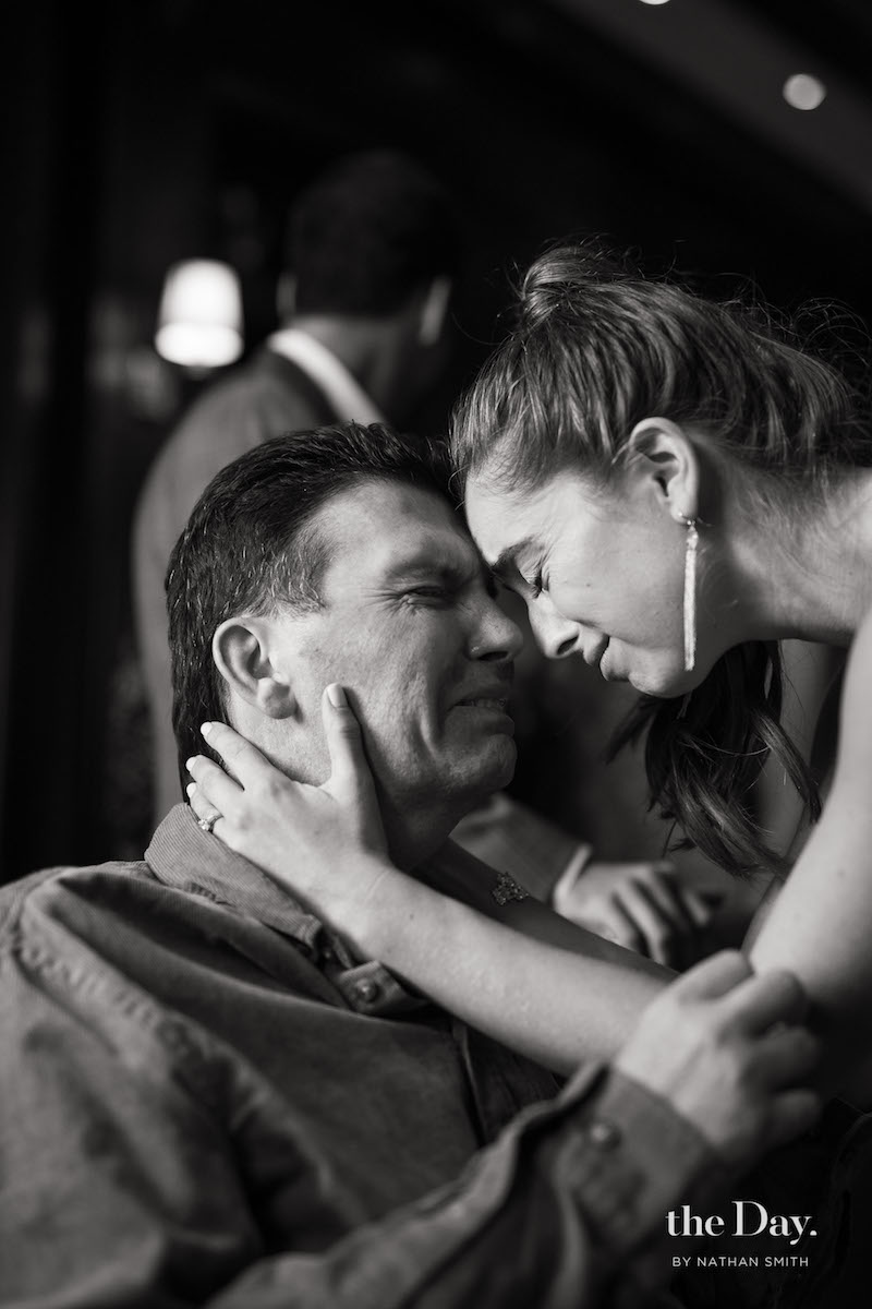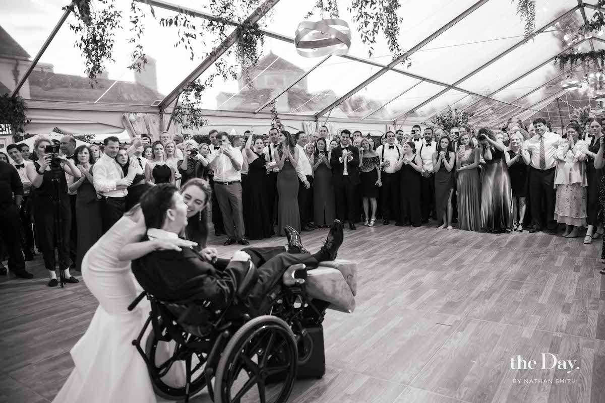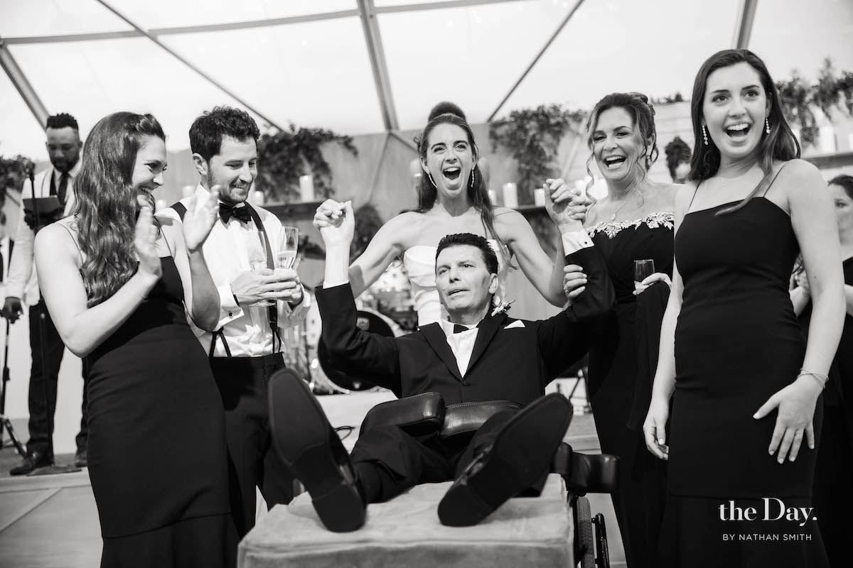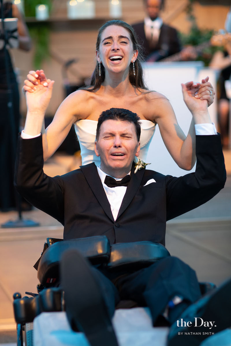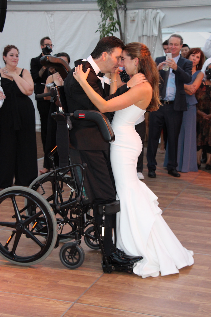 On the day of our wedding, with all the overwhelming emotion, excitement, nerves, etc., after a hot outdoor ceremony, it was time for dad and I to dance. As a gift to my dad, I wrote him a beautiful love song that our band so generously learned and sang for our dance. The moment had come, my mom had just finished reading the speech my dad had written for us, and up he went in the chair. He was able to stay upright standing during our dance for 45 seconds before his pressure dropped. He lost complete consciousness. My mom, sisters and his nurses ran over to us, helped get him into a seated position and raised his legs. He came to in about 3 seconds. Our family had anticipated this, which is why we were so prepared; but this was something our 250 guests had never seen before so it definitely caught people off guard. Although they were touched, it was also very frightening. Despite the episode, Dad and I finished our dance by hugging, singing, crying and smiling. It was one of the most beautiful moments that the whole family and our friends said they were lucky to witness. It was truly the most special and magical moment that I could ever have.