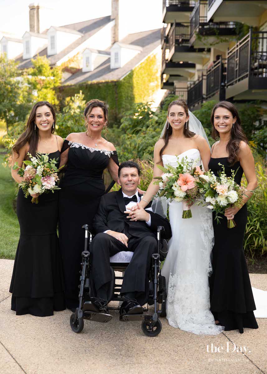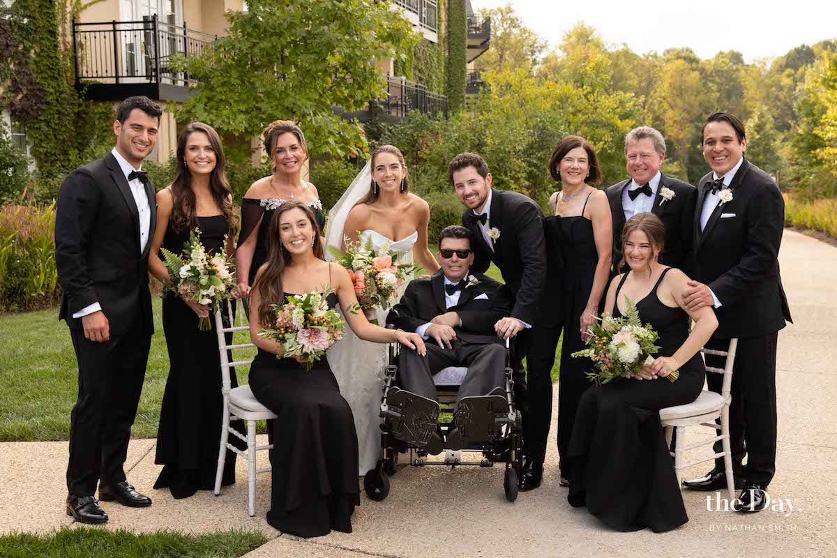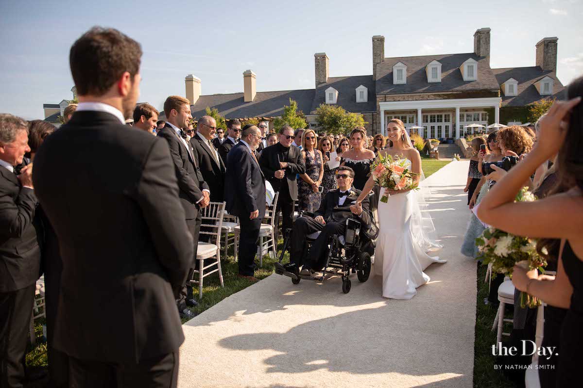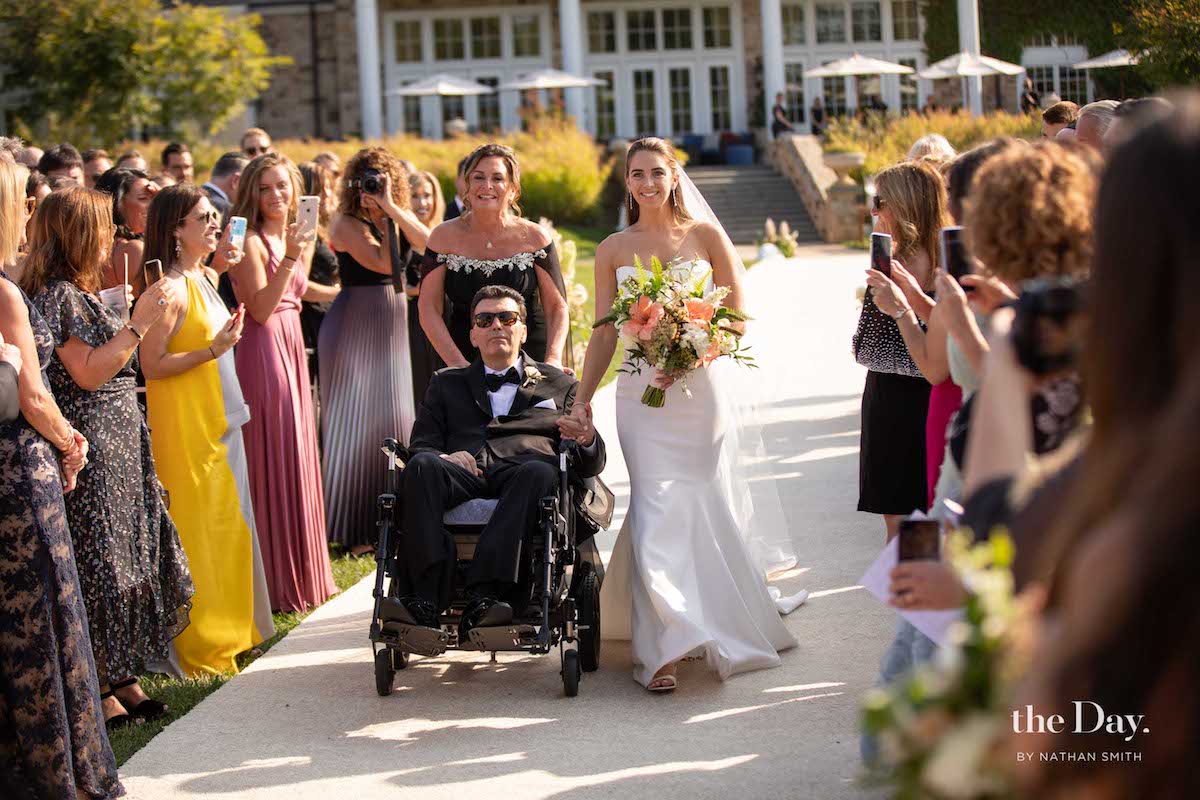 “The day of the wedding was 90 degrees and humid. Dad was in a full tuxedo, looking as sharp as ever, but as everyone affected by MSA knows, heat is very scary as it can drop blood pressure. To combat the heat, we had cold wet towels hidden under his wheelchair to cool him down when needed. He always rocks sunglasses as he has extreme sensitivity to sunlight. Another of his MSA symptoms is extreme heightened emotions, whereby, he could instantaneously start hysterically crying or laughing at any given time. We all embraced it as we always do and loved every moment of him soaking up this most special day. My mother pushed his wheelchair down the aisle while I held his hand and walked right next to them.